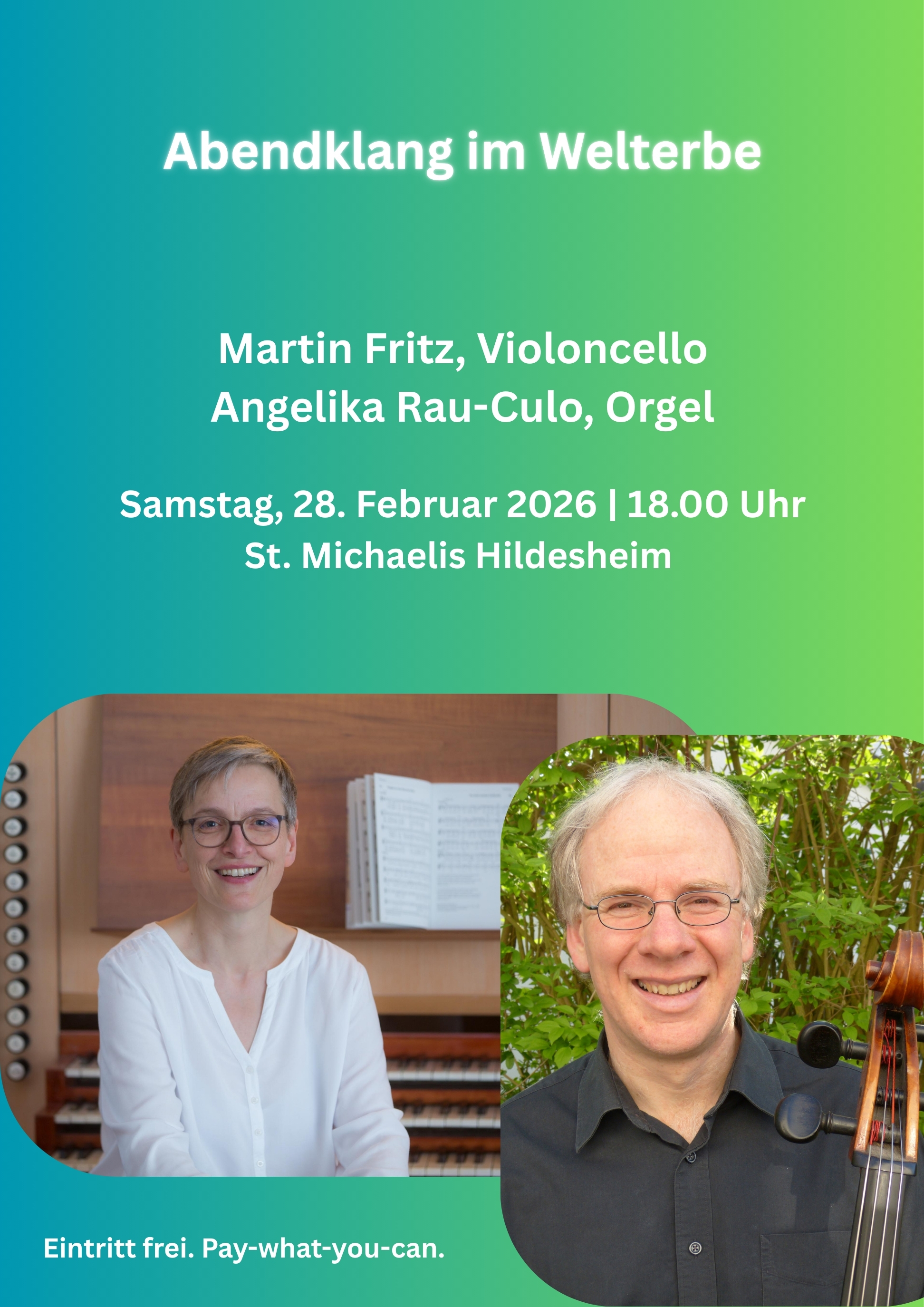 Konzerte und Kirchenmusik Sa, 28. Februar 2026 18:00 Uhr ABENDKLANG IM WELTERBE - Violoncello und Orgel Sa, 7. März 2026 18:00 Uhr ABENDKLANG IM WELTERBE - Posaune und Klavier Sa, 14. März 2026 18:00 Uhr ABENDKLANG IM WELTERBE "Jauchzet dem Herrn, alle Welt" So, 15. März 2026 10:00 Uhr Gottesdienst am Bläsersonntag Terminübersichtsseite